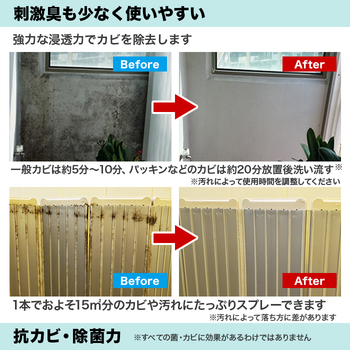 作業性も良く、スプレーや刷毛などで簡単に塗布できスピーディーに浸透して素早くカビをとるので素材を傷めにくい。