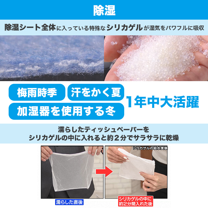 除湿。除湿シート全体に入っている特殊なシリカゲルが湿気をパワフルに吸収。