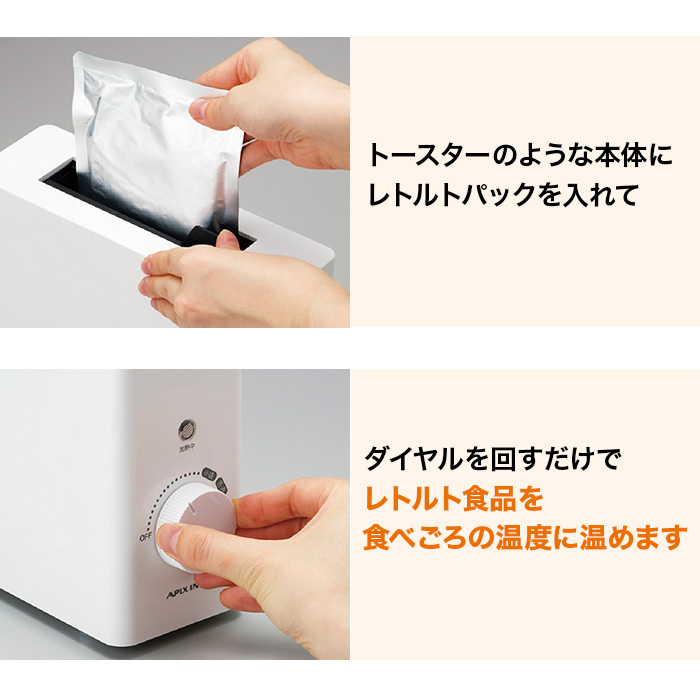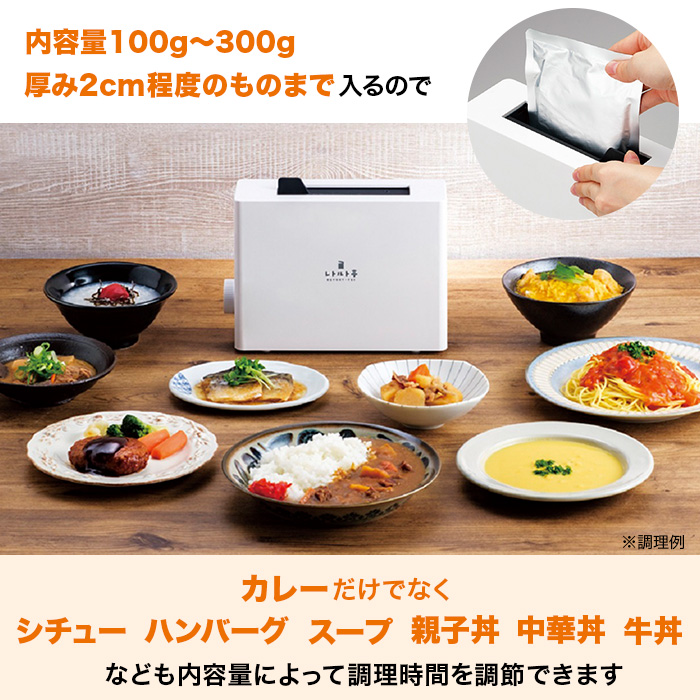 ※レトルト食品の内容量 約100g-300g程度が調理可能です。(レトルトパウチ内の素材や熱さにより異なります)これ以外のものはご使用にならないでください。