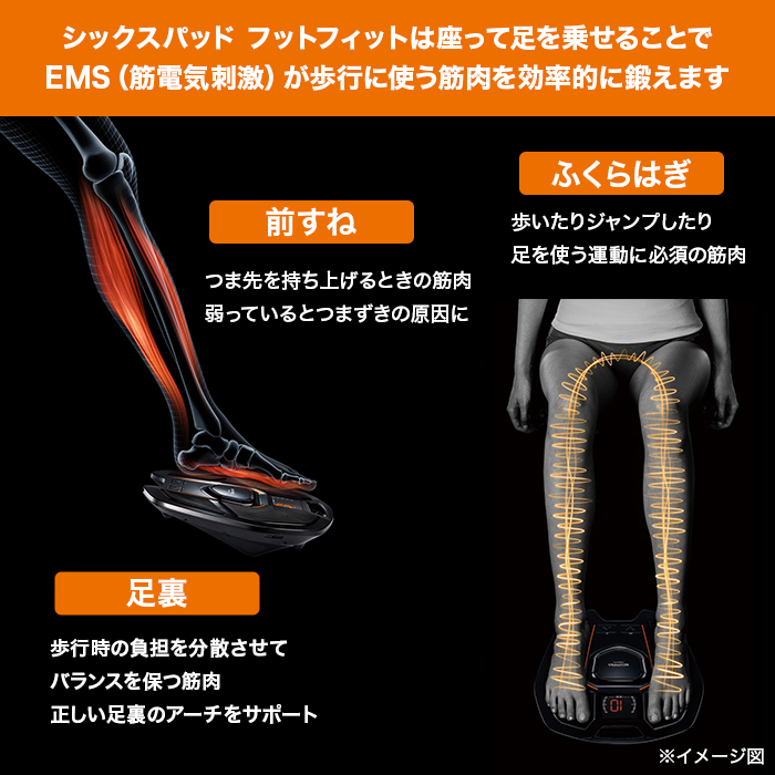 シックスパッドフットフィットは座って足を乗せることでEMS(筋電気刺激)が歩行に使う、ふくらはぎ、前すね、足裏を効率的に鍛えます。
