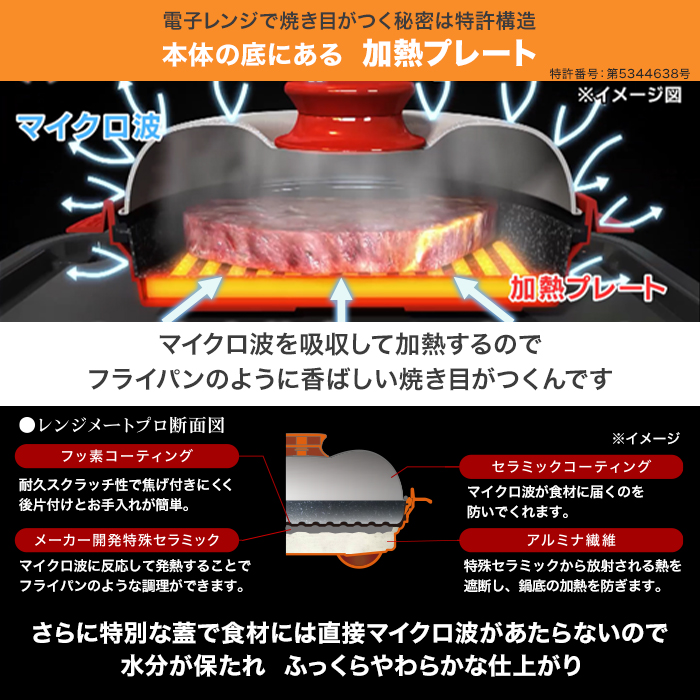マイクロ波を吸収して加熱するのでフライパンのように香ばしい焼き目がつくんです。さらに特別な蓋で食材には直接マイクロ波があたらないので水分が保たれふっくらやわらかな仕上がり。