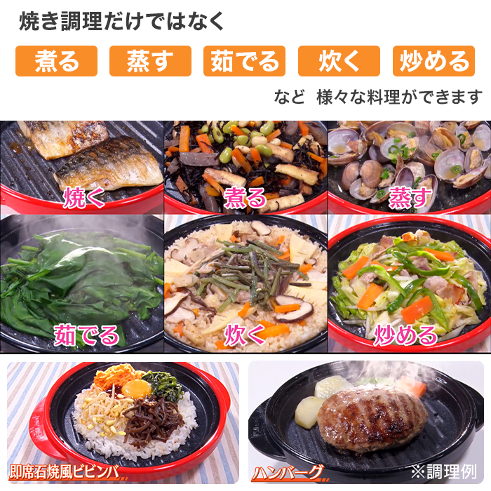 焼き調理だけではなく煮る。蒸す。茹でる。炊く。炒める。など様々な料理ができます。