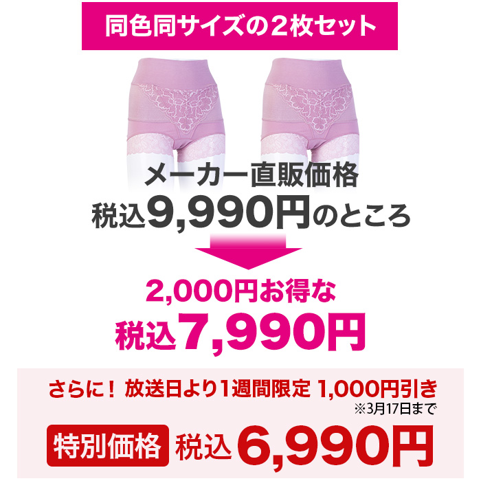 2026年3月11日(水)~2026年3月17日(火)迄に「柔ら美人 骨盤ベルト付き 股関節ショーツ 同色同サイズ2枚セット」をご購入のお客様は税込6,990円にて販売いたします。