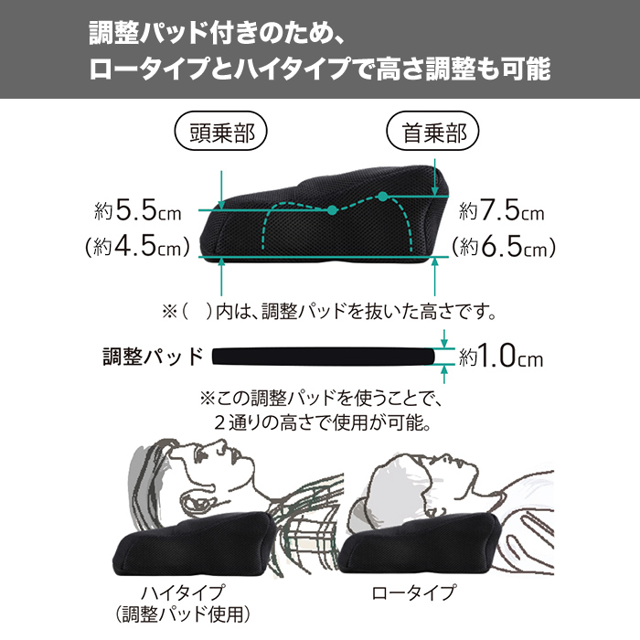 (調整パッド有り)頭の乗る部分の高さ:55mm、首の乗る部分の高さ:75mm