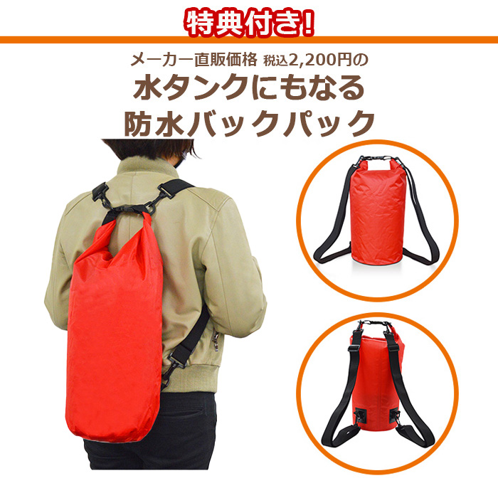 特典としてメーカー直販価格 税込2,200円の水タンクにもなる防水バックパックをお付けします。