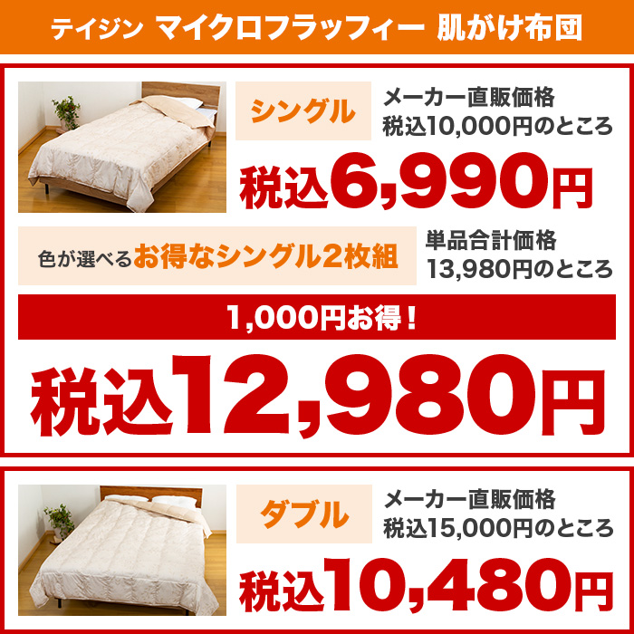 一度のご注文で「テイジン マイクロフラッフィー 肌がけ布団 シングル」を2点ご購入のお客様は単品合計価格税込13,980円のところ1000円お得な税込12,980円にて販売致します。