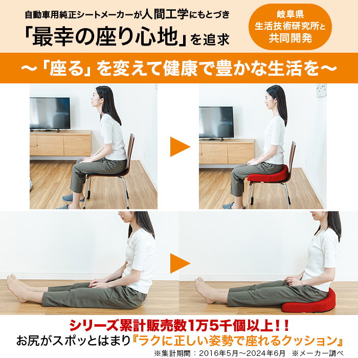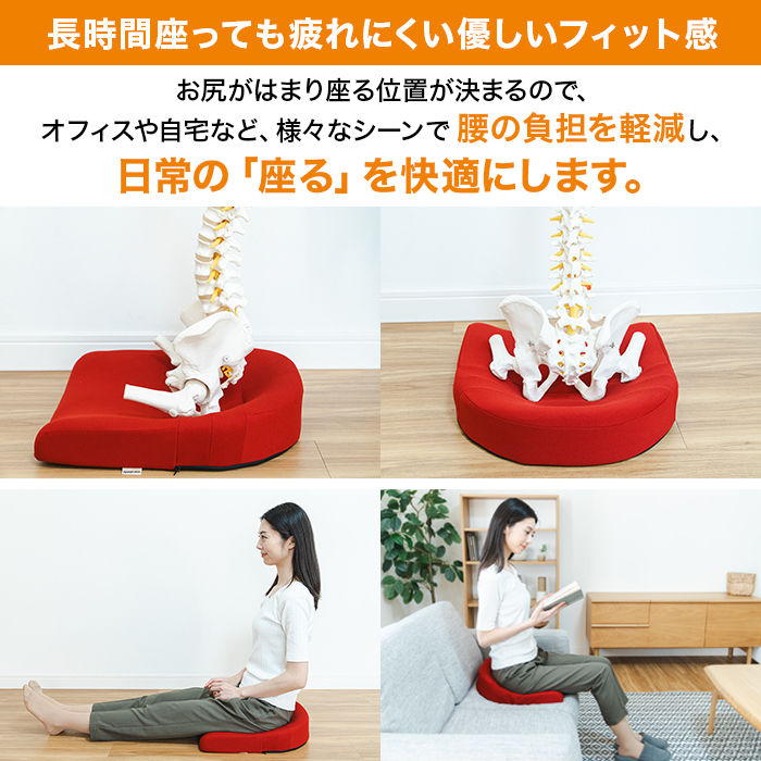 お尻がはまり座る位置が決まるので、オフィスや自宅など、様々なシーンで腰の負担を軽減し、日常の「座る」を快適にします。