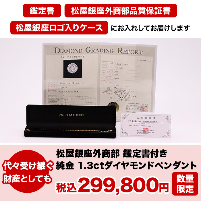1.3ctダイヤモンドペンダント×1、鑑定書×1、品質保証書(松屋銀座外商部発行)×1、ロゴ入りケース×1