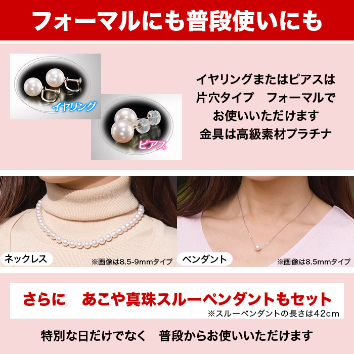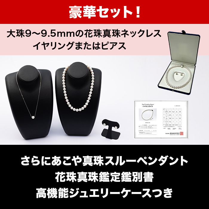 花珠9-9.5mmアコヤ真珠ネックレス、9mmアコヤ真珠イヤリングまたはピアス、9mmアコヤ真珠スルーペンダント、花珠真珠鑑定鑑別書、品質保証書、高機能ジュエリーケース、ご案内書面「修理サービス保証約款」