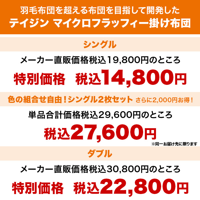 一度のご注文で「テイジン マイクロフラッフィー掛け布団 シングル」を2点ご購入のお客様は単品合計価格税込29,600円のところ2,000円お得な税込27,600円にて販売致します。
