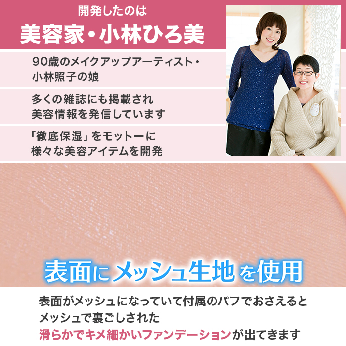 スキンケアでお肌を整えたあと、メッシュ面にパフを押し当てファンデーションを適量とり、軽く叩くようにお肌に塗布してください。※石けんオフが可能(本品のみ使用の場合クレンジング不要)