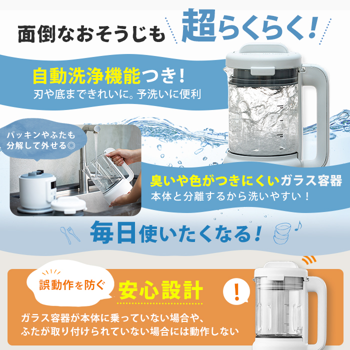 ※ご使用になる前に、付属の取扱説明書をよくお読みの上、正しく安全にご使用ください。*本体やポット底面を水に浸けたり、水をかけたりしない *蒸気口に触ったり、手や顔を近づけない *ポットの中にスプーンや、はしなど調理材料以外のものを入れて運転しない *カッターは鋭利なため、直接手を触れない *製品に異常が発生した場合は、すぐに使用を中止する *子どもが本製品で遊ぶことがないように注意する *ぬれた手で電源プラグの抜き差しをしない *コンセントや配線器具の定格を超える使いかたや、交流100V以外での使用はしない *丈夫で安定した水平な場所に置く *使用中や使用後しばらくは、高温部に直接触れない *専用のポット以外は使用しない *水などの液体を入れず、材料だけで運転しない *運転中にふたを取り外さない *ポットを電子レンジやオーブンに入れない *ポットを冷蔵庫や冷凍庫に入れない *ポットのガラス部分の割れ防止のため、次のような使いかたはしない ・強い衝撃を与える ・急激に熱したり冷やす ・傷がつくような取り扱い ・直火に当てる