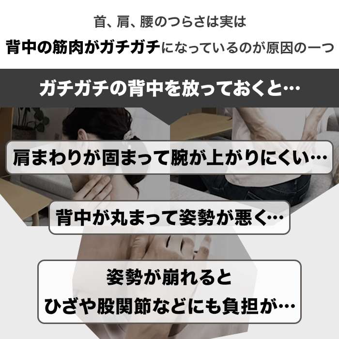 肩まわりが固まって腕が上がりにくい… 背中が丸まって姿勢が悪く… 姿勢が崩れるとひざや股関節などにも負担が…