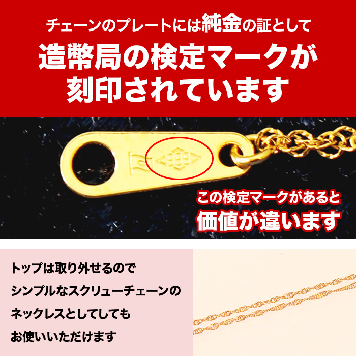 チェーンのプレートには純金の証として造幣局の検定マークが刻印されています