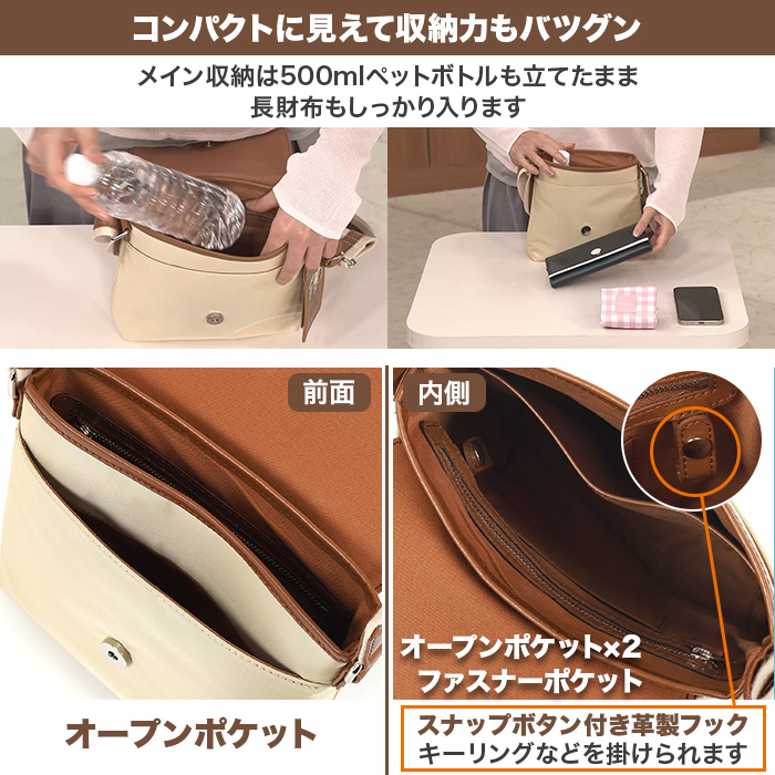 メイン収納は500mlペットボトルも立てたまま、長財布もしっかり入ります。