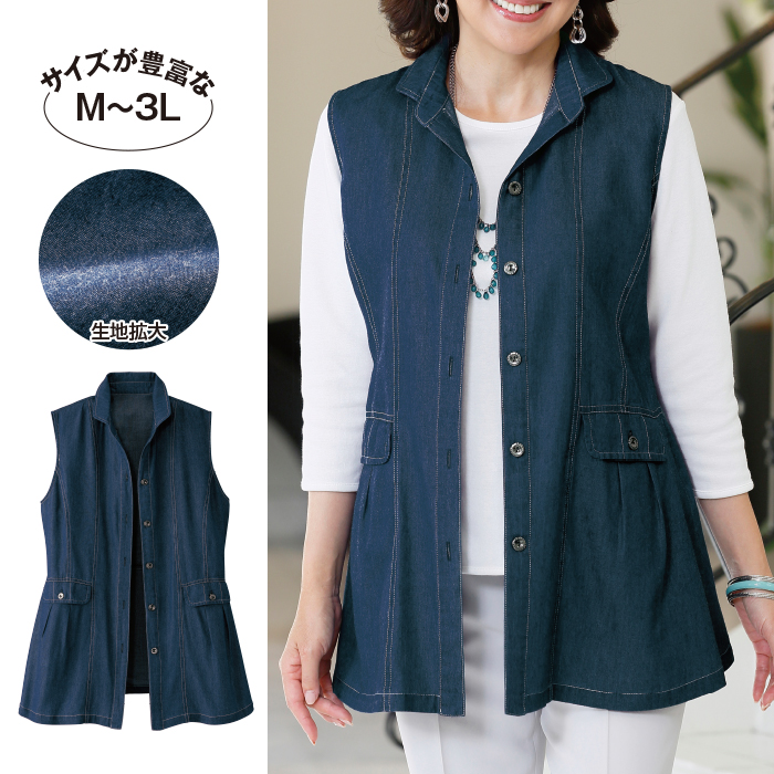 しなやかで艶のある柔らかデニム素材の上品なロングベスト。