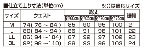 前後左右ポケット付、ウエスト総ゴム(調節ひも付)、前開き(ファスナー)
