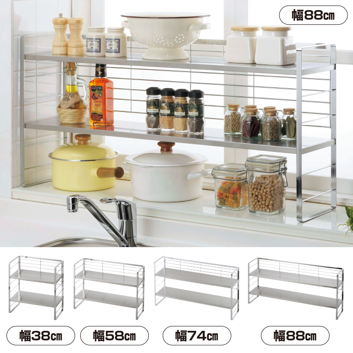奥行20㎝だからコンロ奥などのスペースにも置け、置くものに合わせて棚の高さも調節可能。