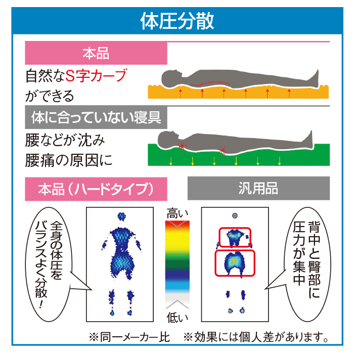 厚さ約10cm!頭・腰・脚部の形状の違いで快適な寝姿勢へ。