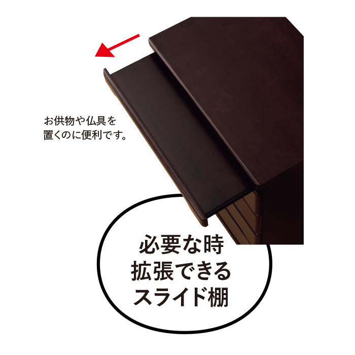 必要な時拡張できるスライド棚付き。お供物や仏具を置くのに便利です。