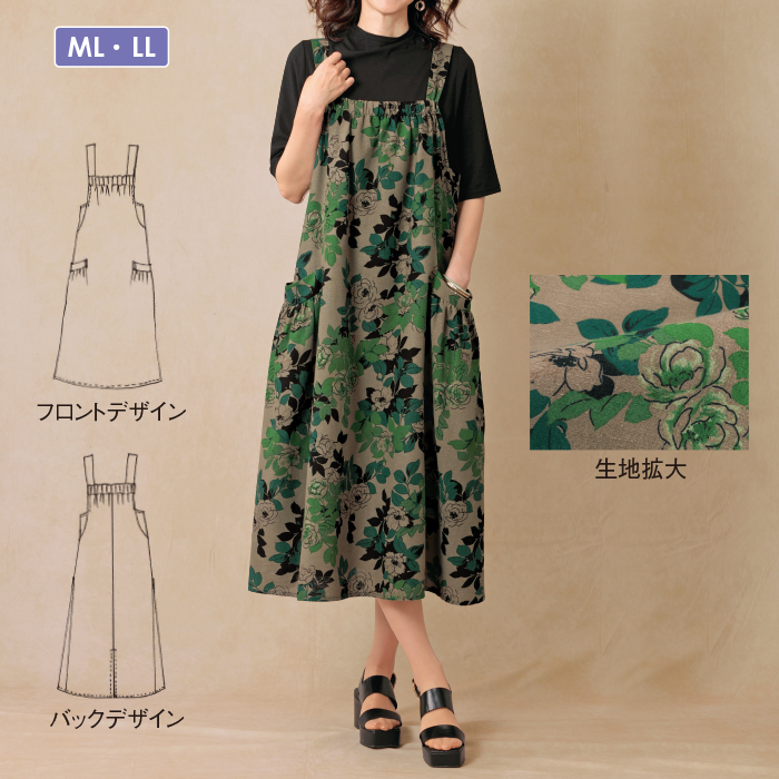 緑色の濃淡がシックなボタニカル柄のジャンパースカート