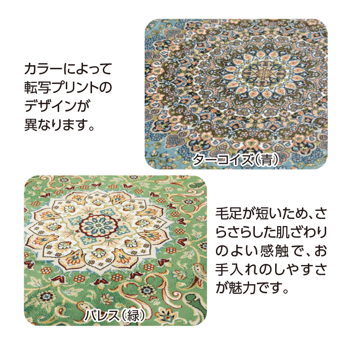 転写プリントにより、高級絨毯のように細部までしっかり表現されたデザイン。敷くだけでお部屋を華やかに演出します。