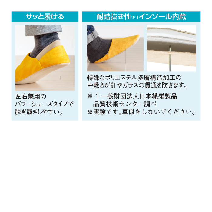 特殊なポリエステル多層構造加工の中敷きが釘やガラスの貫通を防ぎます。