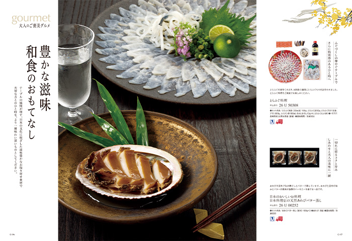 ・掲載商品ジャンル:大人のご褒美グルメ / 特集グルメセレクション / 老舗・名店 / 料理と道具 / 美味探訪 / フローズングルメ / フレッシュギフト / 美味しさ二回便 / 進化するお酒 / 御食事券ギフト