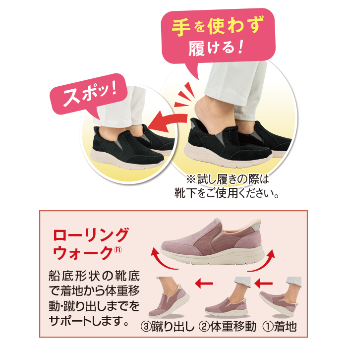 かがまずに履ける靴ベラ形状と幅広5Eが魅力
