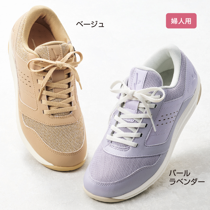 幅広設計、メッシュアッパー、脱ぎ履きしやすい内側ファスナーなど、快適な機能も充実。