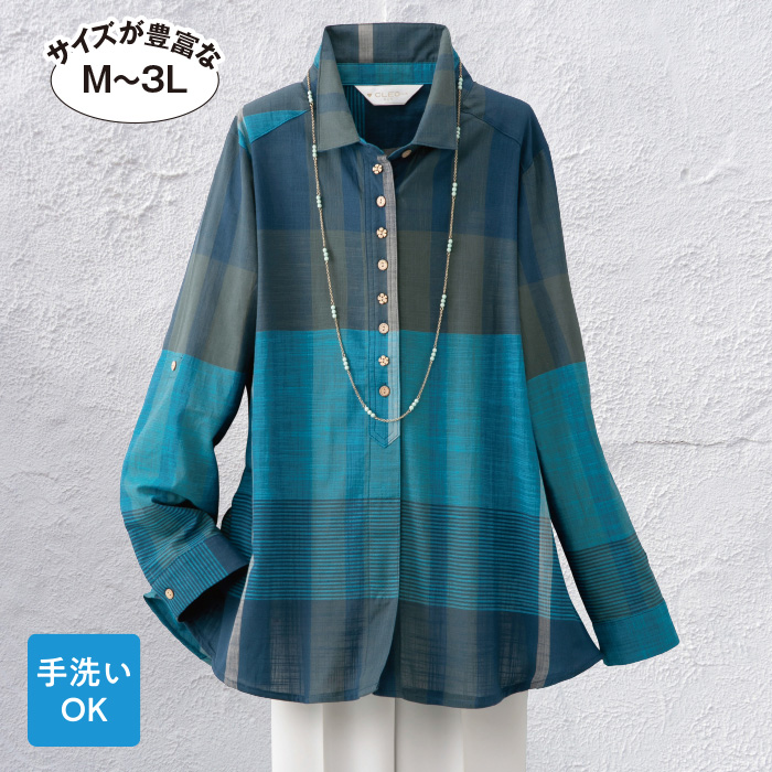 花形ボタンがさりげなくオシャレな、ゆったりブラウス。