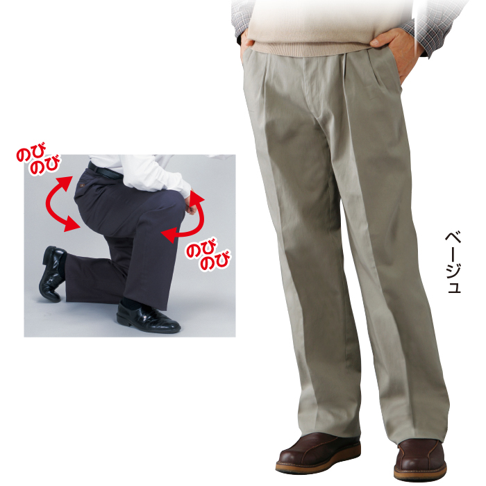 ウエスト両脇ゴム、前後左右ポケット付、前開きファスナー、ツータック
