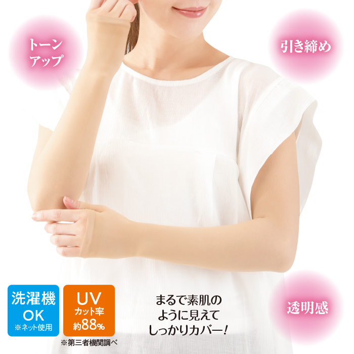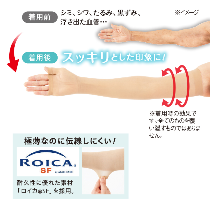 薄さ約0.2mmのストッキングのようなフィット感の極薄着圧アームカバー。