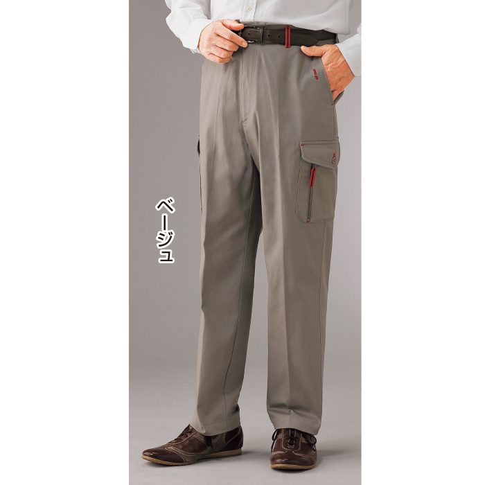 ウエスト後ろゴム、ノータック、両脇・後ろ左右ボタン付フラップポケット付、右サイドフラップポケット付(ペン差し用隙間あり)、左サイドダブルポケット付(ボタン付フラップ+ファスナー)、簡易撥水(完全防水ではありません。)