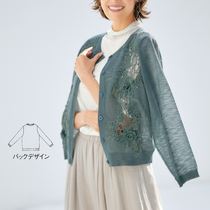 フロントに透かし柄の刺しゅうレースをあしらい、立体的なフラワーモチーフを咲かせたカーディガン。
