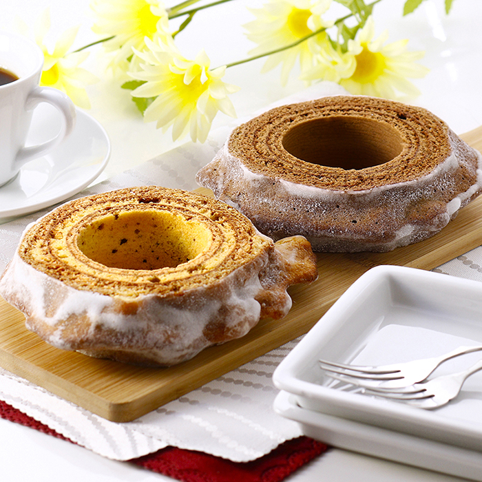 オレンジピールを練り込んだバウムクーヘンと、コーヒーの風味が特長のバウムクーヘンの2種セット