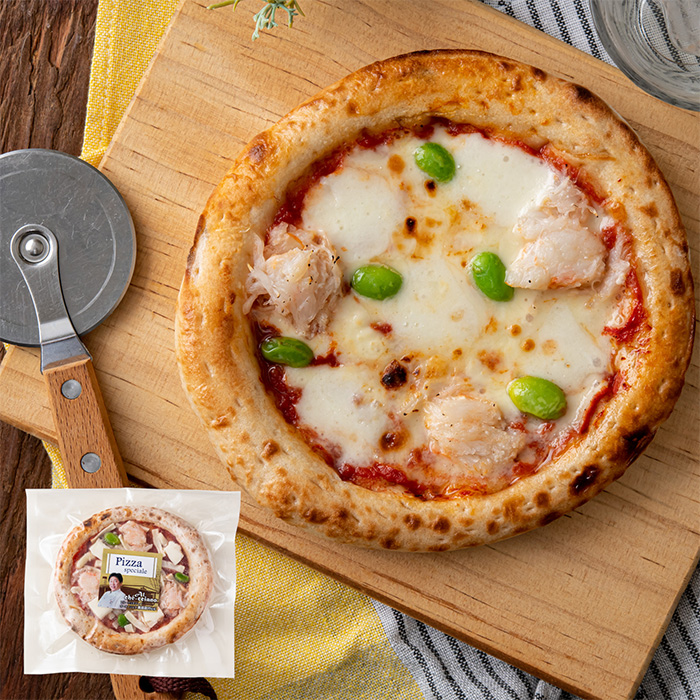 小麦粉(小麦(アメリカ、カナダ、国産))、ナチュラルチーズ、トマトソース(トマト、トマトジュース、食塩)、丸ずわいがに、だだちゃ豆、砂糖、酵母種、オリーブ油、食塩、(一部に小麦・乳成分・かに・大豆を含む)