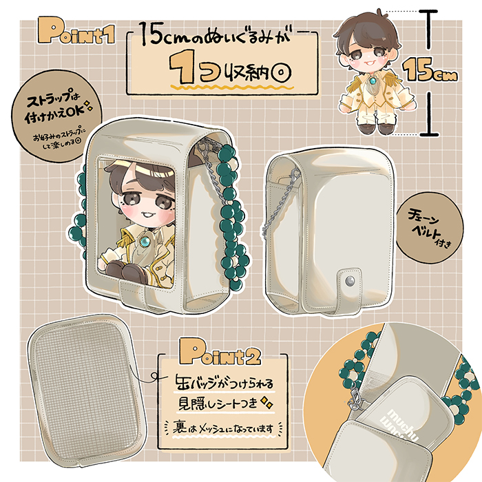 バッグに取り付けられるチェーンベルト付き。かわいい推しぬいとのお出かけに!