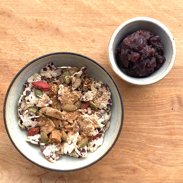 宇治抹茶をベースにした抹茶あんと、きび砂糖で煮詰めた丹波黒豆をトッピングできるちょっぴり贅沢グラノーラです。
