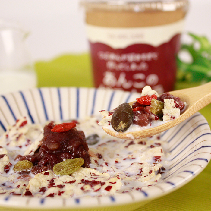 ・普通のシリアルと違い、あんこが別袋でついています。グラノーラを入れ、牛乳を注いだ後たっぷりのつぶあんをプラス。パッケージがそのまま容器に。スプーンも付いています。(画像のものとは異なります)