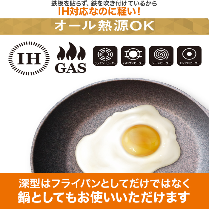 また、IHに対応させるために鉄板を貼ることなく、鉄を吹き付ける加工にすることでオール熱源でありながらフライパンの重量を抑えております。