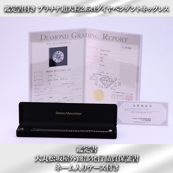 Pt2.5ctダイヤモンドペンダント×1、鑑定書×1、品質保証書(大丸松坂屋外商部発行)×1、ネーム入りケース×1