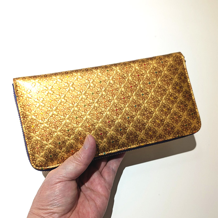 黄金色に光輝く純金箔革に、伝統の花菱柄で型押し、更にひと手間かけて、