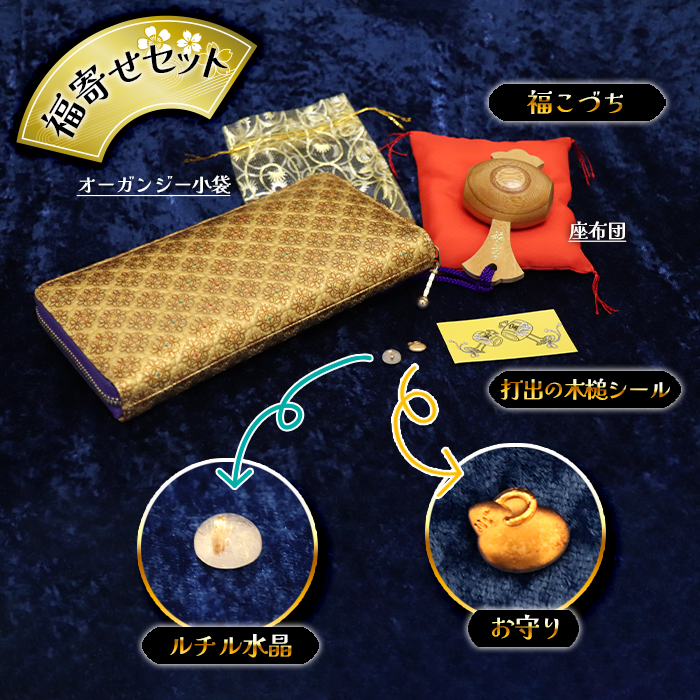 福寄せセット:お守り×1、福こづち×1、座布団×1、ルチル水晶×1、オリジナルデザイン打出の木槌シール(大)×1、オーガンジー小袋