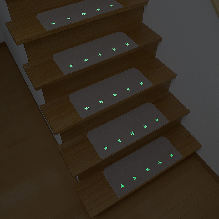 ●カドにすべり止めを取り付けられている階段に使用する時は、すべり止めの奥に敷いてください。●蓄光時間の目安:明るく光って見える時間は2時間程度です。その後、徐々に光度は下がりますが、5時間程度は光って見えます。●蓄光プリントは、あくまで視界を補助するものです。階段の昇り降りには十分注意してください。●明るい場所では光りません。●マットをはがした後、床面がすべりやすくなる場合がありますので、その場合は弱アルカリ性洗剤または、アルカリ性洗剤をうすめた物を使用し雑巾で拭きとってください。