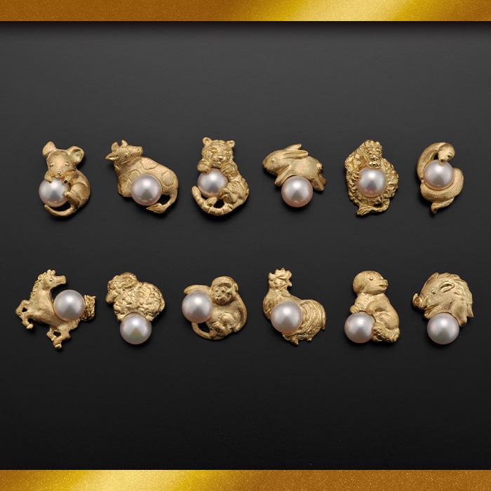 十二支のかわいらしい動物たちとアコヤ真珠を組み合わせたK18製の高級感あるアクセサリーです。確かな素材と工芸品ならではの造形を、毎日を彩るアイテムとして。