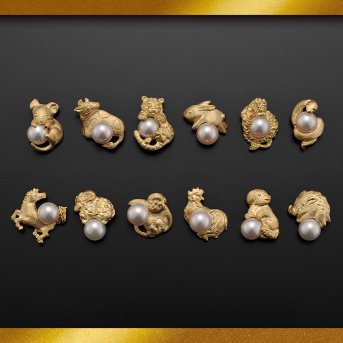 十二支のかわいらしい動物たちとアコヤ真珠を組み合わせたK18製の高級感あるアクセサリーです。確かな素材と工芸品ならではの造形を、毎日を彩るアイテムとして。