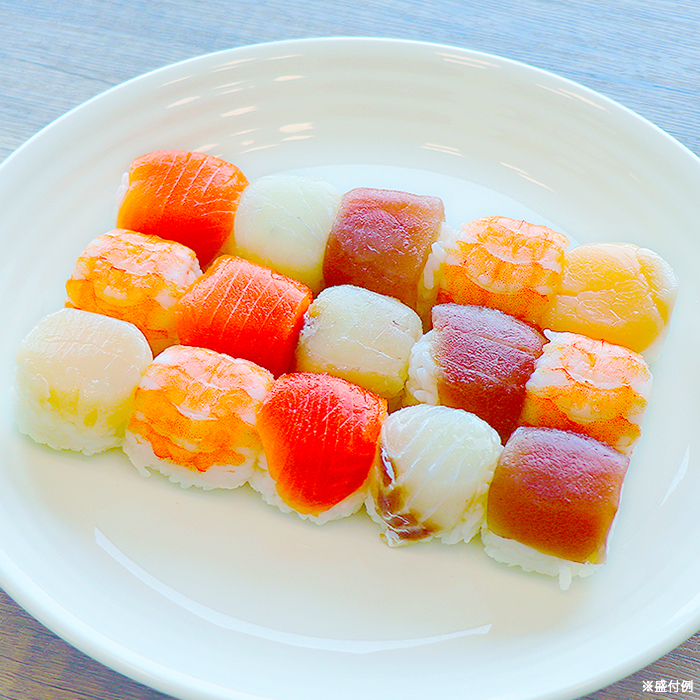 酢飯(米(国産))、エビ、マグロ、タイ、サーモン、ホタテ/トレハロース、調味料(アミノ酸等)、pH調整剤、酸化防止剤(V.C.V.E)、着色料(カラメル)(一部にエビ・さけ・大豆を含む)