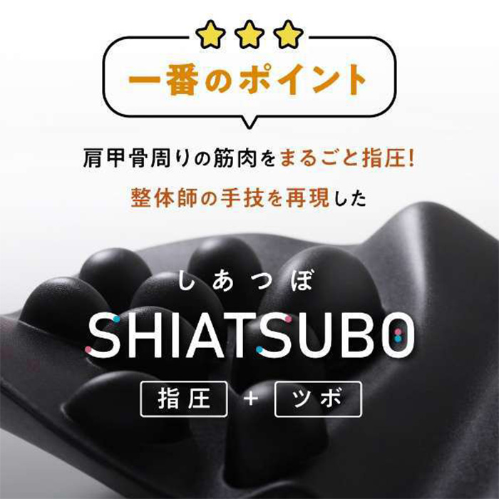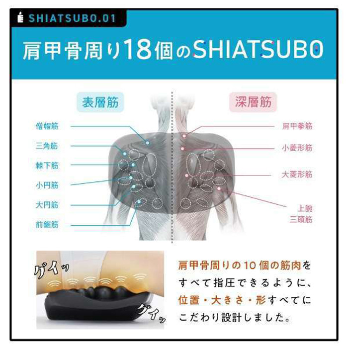 肩甲骨とその周りの筋肉を指圧する18個の突起と背中をサポートするこだわりの曲面形状