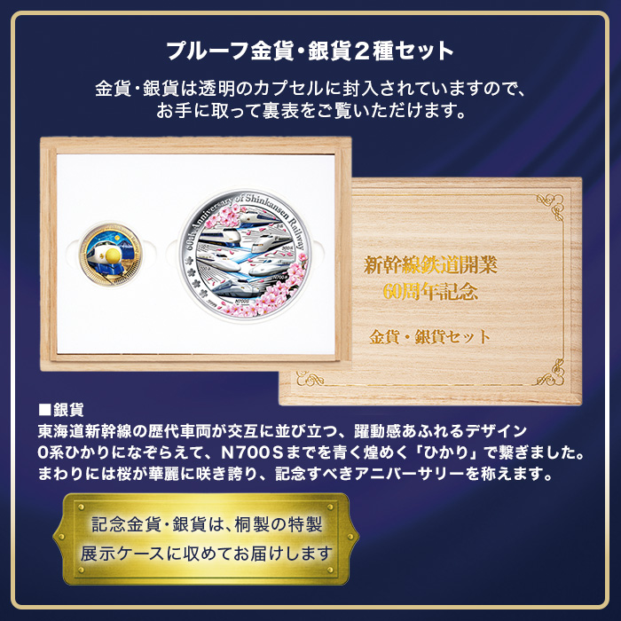 金貨は夜空と富士山を背景に、堂々と駆ける初代新幹線0系、銀貨は東海道新幹線の歴代車両が並んだ豪華仕様。